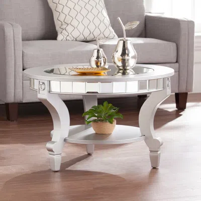 SEI Furniture, Round out a glam look with this elegant mirrored cocktail table. Inset into the tabletop, wide-beveled looking glass shimmers and shines, Hollywood regency style. Hand-placed mirrored tiles adorn the table apron, reflecting light and opening up smallspaces; matte silver saber legs come to a close with a modern version of the claw foot. Spacious tabletop displays coffee table books, flower arrangements, or an in progress board game, while shelf tidies extra magazines, remotes, or entertainment accessories. Come home to your kind of chic with this sophisticated coffee table in the foyer, open concept space, or living room.Product Information - Product Dimensions(inch) - 29 x 29 x 18.5 Product Weight (lbs) - 33 Product Contents - Top - 18Mm Mdf, Rubberwood Veneer; Frame - Rubberwood; Legs - Rubberwood, Iron Weight Capacity - Supports up to - 40 lb. (tabletop), 20 lb. (shelf) Country of Origin - China Assembly Required - Yes Indoor Use Only Care Instruction - Dust with a soft, dry cloth. Clean mirror with glass cleaner.