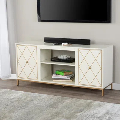 SEI Furniture, Modernize your media space with this chic entertainment console. A spacious top displays your favorite photos and décor or a flat screen TV, while two gold-trimmed cabinet doors keep electronics and accessories organized and out of sight. Gold metal legs give this TV stand a sturdy feel, adding a touch of glam to your design. Add a focal point to your living space or game room when you bring home this modern media console.Product Information - Product Dimensions - 58"W x 15.75"D x 26.75"H Product Weight - 80 lbs Product Contents - Engineered Wood, Iron, Zinc Alloy, Plastic, Magnet Weight Capacity - Supports up to - 85 lb. (top), 30 lb. (each cabinet), 20 lb. (each shelf), 30 lb. (each media shelf) Country of Origin - China Assembly Required - Yes Indoor Use Only Care Instruction - Dust with a soft, dry cloth.