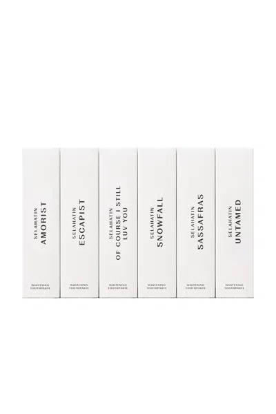 Selahatin Toothpaste Discovery Set in Beauty: NA Selahatin presents an aromatic anthology that encompasses highlights from the label's range. In a new convenient format, conducive to travel or the foundation for a wardrobe of toothpastes, they are offering 'Amorist', 'Escapist', 'Of Course I Still Luv You', 'Sassafras', 'Snowfall' and 'Untamed'.. Vegan and cruelty-free. Vetted by Swedish Dental Association. Betaine relieves dry mouth Edelweiss Extract restores and heals gums. 25ml x 6. Use morning and night during oral care routine.. STIX-WU14. 7007002. About the designer: