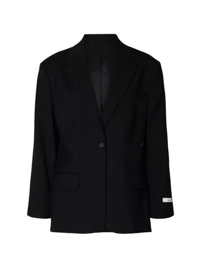 black notched lapels front flap pockets button fastening long sleeves double-breasted
