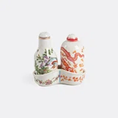 Literally fusing East and West, Seletti's 'Hybrid' collection brings a contemporary touch of wit and flare to tables. The 'Thea' spice shaker set includes two decorated designs in a porcelain holder. One shaker, ringed with red, and the respective side of the holder, depicts a red flying dragon with flames. The other, ringed with gold, presents a bird in flight, with European-style flowers in shades of green and lilac. This multicolor duo is a practical statement piece that pairs perfectly with other designs from the Seletti series by Ctrlzak.