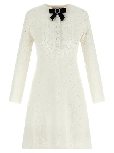 Self-Portrait presents a charming mini dress, artfully crafted from delicate lace knit fabric that showcases a subtle diamond pattern throughout. The standout feature is its distinctive bib collar, adorned with intricately designed lace detailing and complemented by a series of fabric-covered buttons that elegantly trace the front. A striking black velvet bow, embellished with a sparkling rhinestone buckle, adds a touch of opulence at the neckline. This captivating piece features three-quarter length sleeves and a slightly flared hem, making it a versatile addition to any wardrobe. Perfect for those who embrace a vintage-inspired aesthetic, this dress embodies feminine grace and timeless elegance. Composition - Lace Gender - Women Style - Elegant, Feminine, Vintage-inspired