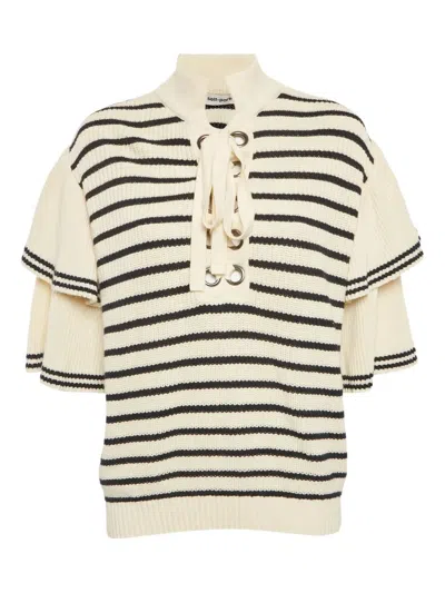 white striped pattern black stripes rib knit lace-up neck Condition: EXCELLENT. This previously owned item is in near-perfect condition with no signs of damage or use.