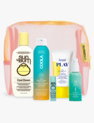 Selfridges SPF Bundle 2025Includes:Sun Bum Cool Down After Sun Lotion 237mlSun Bum CocoBalm Lip Balm 4.2gCoola Suncare Classic SPF30 Sunscreen Spray 177mlCoola Suncare Scalp & Hair SPF30 Sunscreen Mist 60mlSupergoop! PLAY Everyday Lotion SPF 50 30mlSelfridges Embroidered-Tag Sheer Nylon Wash BagSkin type: suitable for all skin typesWorth £90For hygiene reasons, we are unable to exchange or refund this product, unless faulty.