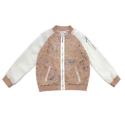 Elevate any outfit with this adorable bomber jacket featuring embroidered silver moons and stars. A stylish yet comfortable addition, it’s the perfect piece for your daughter's wardrobe!True to size Two-tone silk bomber jacket Dreamy silver moon and stars embroidery detail Zipper pockets with grosgrain Boxy silhouette with raglan sleeves Blush tonal rib knit trim at neck, cuff, and waist100% Viscose Fully lined Dry clean only