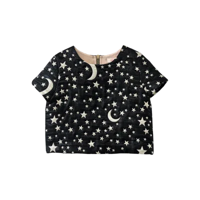 The Sama Top shimmers like the night sky, adorned with intricate stars and moons that create a magical statement piece. This elegant top adds a touch of sophistication to any outfit, making it perfect for special occasions or everyday wear!Metallic black and silver star and moon jacquard fabric for a striking lookShort sleeves for a comfortable and stylish fitGold metal exposed zipper closure at the center back neckline for easy dressingFully lined with soft pink Crepe de Chine for added comfortTrue to sizeMade in ItalyDry clean onlyComposition: 92% Polyester, 8% Metallicized Polyester