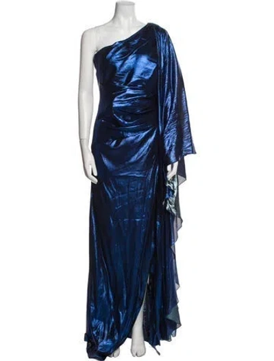 Sem Sem Silk Evening Gown Blue & Metallic Pleated & Ruffle Accents Three-Quarter Sleeve with One-Shoulder Concealed Zip Closure at Back Fit: Dresses by Sem Sem typically fit true to size. | SemSem Silk Long Dress in Blue/Metallic, Women's M