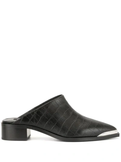 Wbony black calf leather Linnea mules from Senso featuring a pointed collar, an embossed crocodile effect, a slip-on style and a chunky low block heel.