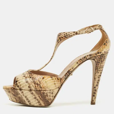 Pre-owned Beige/brown Python Leather T-strap Platform Sandals Size 39