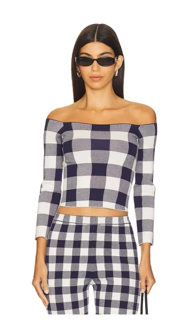SER.O.YA Vale Top in Navy. Size L, M, S, XL, XXS. 49% polyester 33% viscose 18% spandex. Dry clean only. Off the shoulder styling. Plaid design throughout. Midweight ponte fabric. Item not sold as a set. SERR-WS196. S-PF25-4961-12. SER.O.YA is a New York-based contemporary brand with a purpose that transcends fashion. Through a collection of unconstrained, gender-optional designs, SER.O.YA aims to be a vessel for positivity: spreading good energy, encouraging connectivity, and catalyzing social movement. Each drop, SER.O.YA partners with a different organization, with a portion of the proceeds being donated to each charitable cause. We say do you, wear you.
