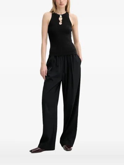 black ribbed texture sleeveless round neck gold-tone buttons keyhole detail