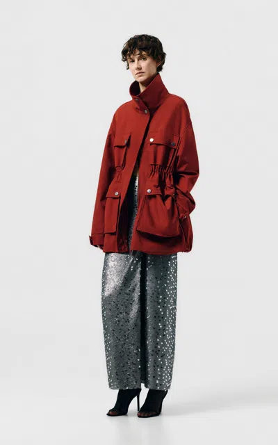 SEV Technical Jacket in Red 48% cotton 48% polyester 4% elastane. Hand wash. Hidden front zipper closure. 4-front flap pockets. Elasticized waist. Buttoned cuffs. Back storm flap. Twill fabric. STVF-WO3. 25FW-6007. About the designer: