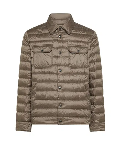 dark taupe two chest patch pockets front button closure point collar quilted design