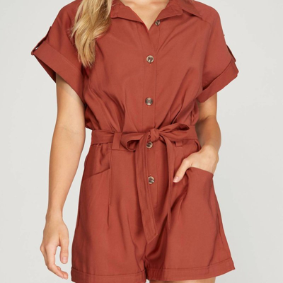 It doesn't take much for this one piece to look effortlessly cool. Add some statement jewelry to dress it up, or throw on some sneakers for a more casual vibe.This Adorable Utility Cargo Romper In Rust Will Become Your Favorite Of The Season! Romper Is Designed With Button Down Front Closure And Self Tie Belt. In A Drop Shoulder Short Sleeve Rolled Cuff With Button Detail. Romper Has Deep Utility Pockets And Cuffed Hem. This Woven Twill Romper Looks Great With Sandals, Flats And Even Sneakers. Model Is 5'9.5" And Wearing A Size Small