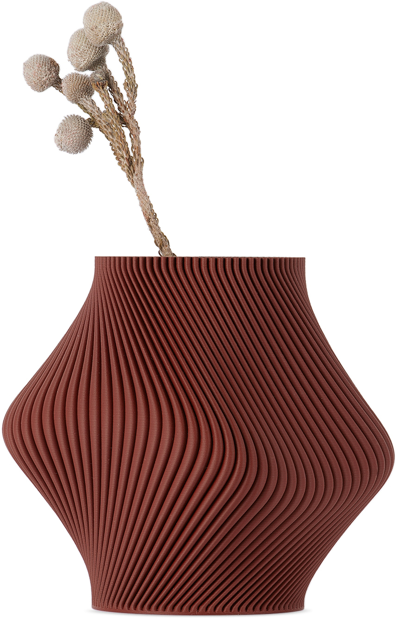 Sculptural 3D printed PLA vase in red. Removable borosilicate glass cylinder at interior. · Vase: H5.5 x D3 in / 144 g · Glass cylinder: 525 mL Each item is unique. Please note coloration may vary. Supplier color: Ruby red