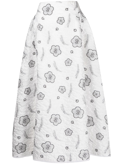 quilted A-line jacquard skirt from SHIATZY CHEN featuring white, quilted, patterned jacquard, all-over floral embroidery, high waist, concealed rear fastening, flared and calf-length.
