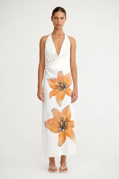 The Elaina Dress in Tigerlily is a sleek, bold piece for any special occasion. Fully lined for a smooth fit, the bodice crosses over at the front, with elegant draping into pleats at the side for a flattering silhouette. The hand painted placement print adds an artistic touch, while the low back is finished with delicate rouleau halter ties and gold cord ends for a touch of luxury.. PRODUCT DETAILS. - Midi dress- Satin fabrication- Fully lined- Side invisible zipper- Draped bodice with pleats at side waist- Low back with rouleau halter ties and gold cord ends- Hand painted placement print on front. Model is 178cm / 5"10 wearing an AU 8 / US 4. Composition: 95% Viscose, 5% Elastane.