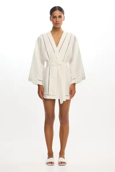 A timeless silhouette with feminine detailing, the Izzy Long Sleeve Dress in Ivory is crafted from a lightweight linen blend fabric. Designed to be a relaxed fit, this mini dress features long bell sleeves, a self-waist tie for shaping and delicate ladder trim detailing through the neckline, front and hem. Perfectly paired with a sandal for beach to bar attire. . PRODUCT DETAILS. - Mini dress- Long bell sleeves- Self-waist tie- Ladder trim detailModel is 178cm / 5'10" wearing an AU 8 / US 4Composition:Main: 55% Linen, 45% ViscoseLace: 100% Cotton