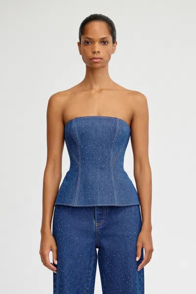 Perfect for making a statement, the Juno Top in Diamante Denim is fully lined and features a gunmetal exposed back zipper. This strapless top is boned above the waist for structure and flares towards the hips, with twin needle topstitching details throughout for a refined finish.. PRODUCT DETAILS. - Strapless Top- Fully Lined- Gunmetal Exposed Back Zipper- Boned Above Waist- Twin Needle TopstitchingModel is 180cm / 5 ft 10 inches wearing an AU 8 / US 4Composition: 100% Cotton.