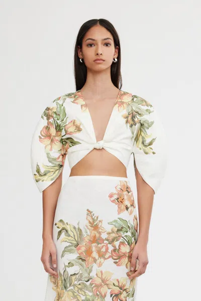 A sweet silhouette, designed to be fitted through the bodice and relaxed through the sleeve. The Parisa Top in Botanic is crafted from a crisp linen fabrication. Featuring a plunging neckline, twisted detail though the bodice, curved sleeve detail and beautiful placement print throughout.. PRODUCT DETAILS. - Cropped silhouette- Accentuated sleeves- Lined- Open back zip Model is 178cm / 5’10” wearing a 6AU / 2US Composition:Main: 100% LinenLining: 100% Cotton