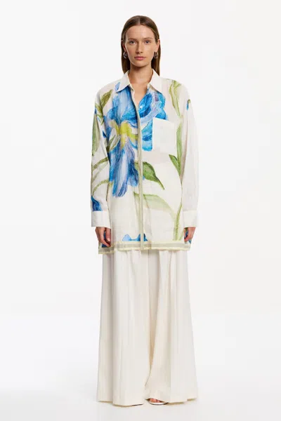 A bold take on a wardrobe classic, the Tess Shirt in Iris Bouquet combines an oversized fit with a striking floral print. Designed with a concealed button placket and cuffed sleeves, this shirt adds effortless elegance to any look. Pair it with tailored trousers for a polished outfit or wear it open over swimwear for a relaxed look.. PRODUCT DETAILS. - Oversized shirt- Placement print- Concealed button placket- Sleeve cuffs with button closure- Breast pocketModel is 174cm / 5'8.5" wearing an AU 8 / US 4Composition: 100% Cotton.