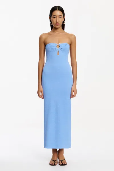 An eye-catching take on elevated dressing, the Vada Midi Dress in Cerulean is effortlessly chic. Crafted from a textured fabrication, this strapless silhouette is elevated by a clear acetate star with silver glitter detailing at the bust - adding a subtle hint of sparkle. Perfect for summer soirées and evening events, pair it with sleek heels and statement earrings to complete the look.. PRODUCT DETAILS. - Strapless midi dress- Clear acetate glitter star - Textured fabric- Fully lined- Invisible back zip closureModel is 178cm / 5'10" wearing an AU 8 / US 4Composition:Main: 94% Polyester, 6% ElastaneLining: 84% Polyester, 16% Elastane