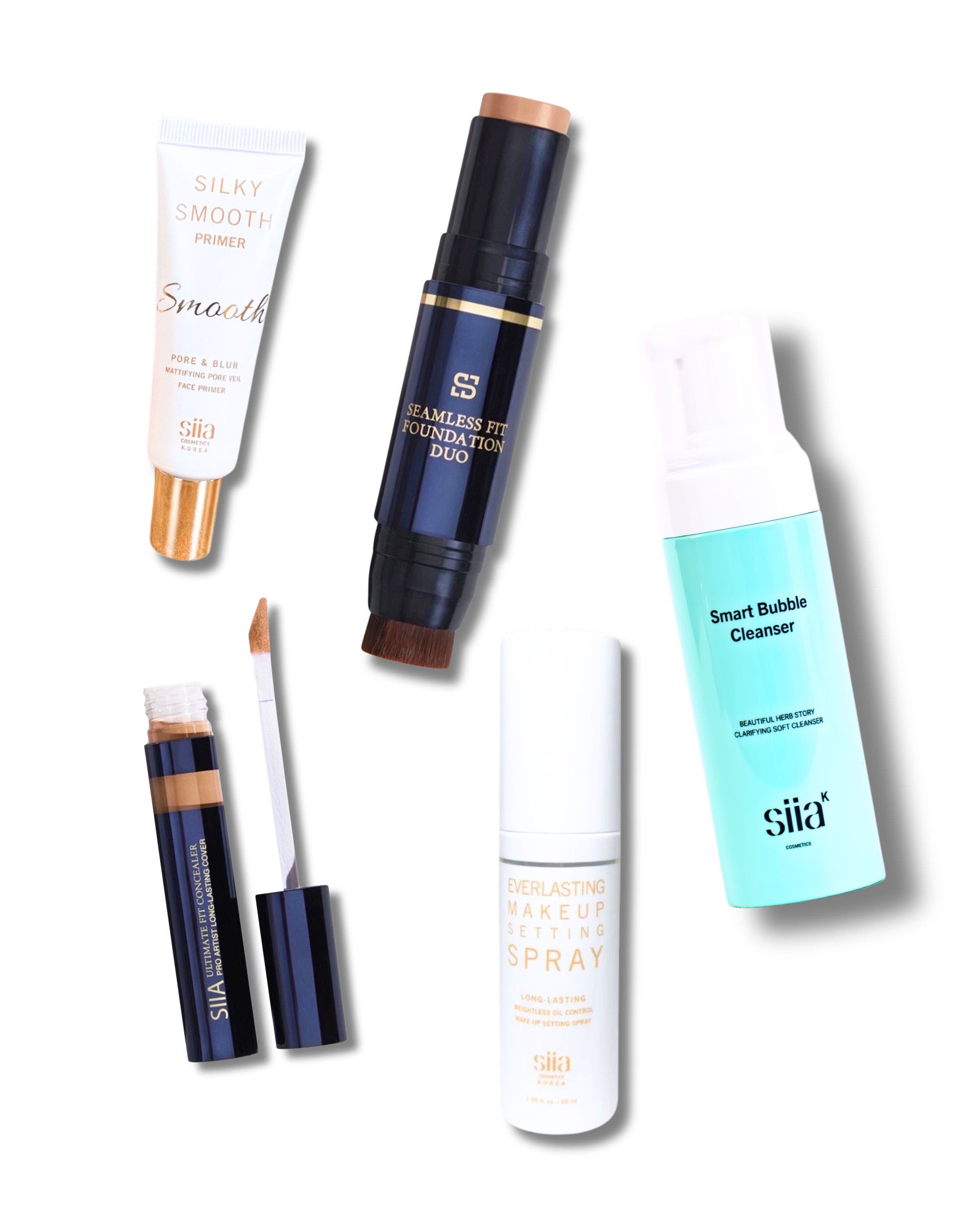 Perfect Base Collection W302 Set.A complete complexion-perfecting set infused with Korean skincare — primes, covers, sets, and cleanses for hydrated, smooth, and radiant skin all day. WHAT’S INCLUDED: Ultimate Fit Concealer W 302 WALNUT, Seamless Fit Foundation Duo SW 02 GOLDEN SAND, Silky Smooth Primer N/A, Everlasting Makeup Setting Spray (Fixer), Smart Bubble Cleanser.SIIA COSMETICS is a luxury K-BEAUTY cosmetics brand, 100% made in South Korea. Combining the finest Korean skincare ingredients and cutting-edge technology, SIIA delivers high-performance makeup that also cares for your skin.KEY INGREDIENTS: Tocopheryl Acetate – Antioxidant rich in vitamin E. Natural Protector – A blend of 7 non-toxic herbal ingredients that calms irritation and strengthens the skin’s protective barrier. Fruits Newplex – A vitamin packed blend of pomegranate, grapefruit, mulberry and ginkgo. Tannin Complex – A blend of 7 non-toxic, natural ingredients that increase collagen production. Tea Leaf Extract – Minimizes oil production. Strawberry Fruit Extract – Rich in vitamin B and C, minimizes oil production. Pineapple Fruit Extract – Reduces redness.