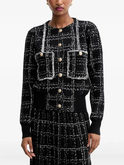 black tweed knit gold button embellishment frayed trim detail patch pockets round neck