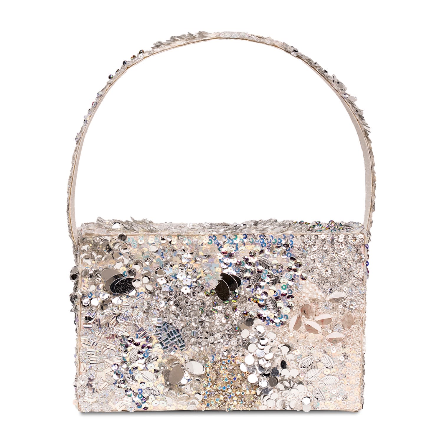 Box clutch drenched in sequins, beads, and crystal-like sparkle. Finished with a matching top handle, it’s your instant spotlight for weddings, soirées, and festive nights out. 8.5" L x 5" H x 2" D Sequin top handle Interior velvet lining Magnetic snap closure Holds a phone, lip gloss, keys etc.