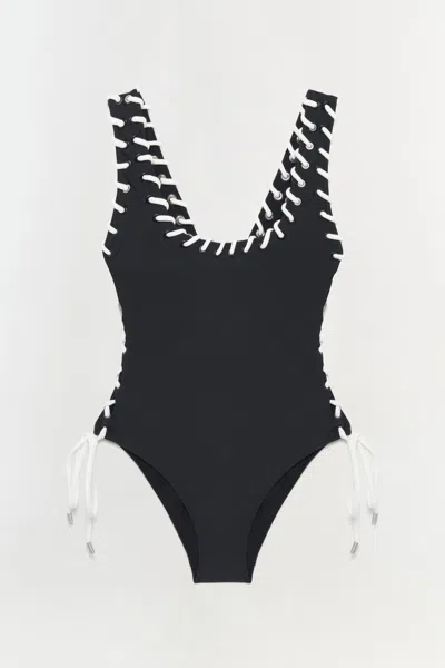 Rooted in a sporty aesthetic, the Dayton one-piece decorates its black silhouette with white whipstitch trim. Self-tying laces at the hips create adjustable comfort. Pull-on Contrast whipstitch trim Side tie details Self: 80% recycled nylon, 20% spandex Lining: 80% polyamide, 20% spandex Hand wash cold, dry flat Imported Size & Fit Model (wearing size S): 5ft 11in tall Please note, below measurements reflect SIMKHAI's size chart, not the actual garment. Size XS (US 0-2): 32-33in bust, 25-26in natural waist, 35.5-36.5in low hip Size S (US 4-6): 34-35.25in bust, 27-28.25in natural waist, 37.5-38.75in low hip Size M (US 8-10): 36.5-38in bust, 29.5-31in natural waist, 40-41.5in low hip Size L (US 12): 39.5in bust, 32.5in natural waist, 43in low hip SIMKHAI Women's Dayton Whipstitch-Trimmed Swimsuit in Black White Nylon/Polyamide/Spandex