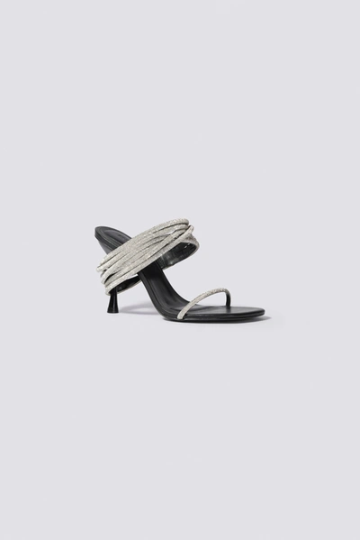 The Infinity Siren in Black. Wrapped with shimmering crystal straps for a touch of sparkle, these heels balance bold textures with a sleek silhouette, making them a glamorous addition to any evening wear.