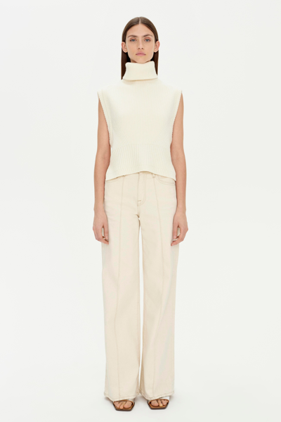 PRE-SPRING 2024 READY-TO-WEAR. The Maple Top in Ivory. Showcasing a plush turtleneck and sleeveless cut, this piece seamlessly blends contemporary edge with classic allure. Its tailored fit epitomizes chic simplicity and modern elegance.
