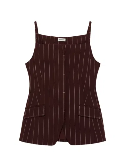 PRE SPRING 2026 WOMEN'S COLLECTION The Edie Square Neck Top in Mahogany Stripe Cut in a fine pinstripe suiting, this top contours the body with precision seaming and a defined waist. The squared neckline and structured flap pockets lend a modern edge to a classic form. SIMKHAI Women's Edie Square Neck Top in Mahogany Stripe, Size 10