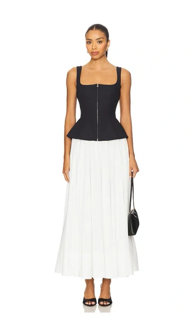 SIMKHAI Jolynn Midi Dress in Black,White Self 1: 59% nylon 37% cotton 4% spandex Self 2: 100% polyester Lining: 100% cotton. Machine wash. Fully lined. Hidden front zipper closure. Front and back square neckline. Side slit pockets. Crepe fabric at tope. Poplin fabric at skirt. JSIM-WD704. 425-1009-S. About the designer: New York born and raised designer, Jonathan Simkhai started his fashion fascination at the early age of 14 where he built his buying skills working at a local retail clothing store. He took his love for the industry and went on to attend Parsons and FIT. His self titled women's collection debuted in 2010 showcasing the cross between genders. Jonathan's design aesthetic is menswear-inspired pieces incorporated into feminine silhouettes that remain classic and sophisticated for the modern, cosmopolitan woman.