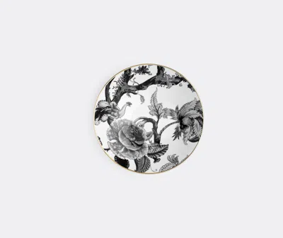 This decadent soup plate by Simone Guidarelli Home features vivid, intricate blooms, leaves and branches in black and white, encircled with hand-finished gold edging. A miniature peacock amid the foliage enchants the richly detailed scene. Part of a series of tableware that renders opulent compositions in monochrome, the design is drawn directly from Guidarelli's maximalist wallpaper portfolio. Suitable for soups, stews and pasta dishes, the 'Secret Garden' soup plate can be mixed and matched with other designs from the 'Souvenirs De Voyage' collection, or introduced into pared-black tablescapes as a statement in its own right. Not dishwasher safe.