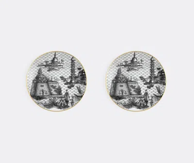 This decadent bread plate by Simone Guidarelli Home features four richly detailed temple scenes in black and white, encircled with hand-finished gold edging. A tessellated patterned background, recalling clouds and bells, brings a graphic, contemporary feel to the piece. Part of a series of tableware that renders far flung places in monochrome, the design is drawn directly from Guidarelli's maximalist wallpaper portfolio. Inspired by the timeless appeal of Chinoiserie, the 'Oriental Dream' bread plate, which comes as a set of two, can be mixed and matched with other designs from the 'Souvenirs De Voyage' collection, or introduced into pared-black tablescapes as a statement in its own right. Not dishwasher safe.