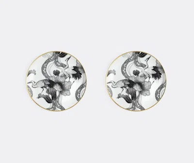 This decadent bread plate by Simone Guidarelli Home features herons, botanicals, and stylized running water in black and white, encircled with hand-finished gold edging. Part of a series of tableware that renders opulent compositions in monochrome, the design is drawn directly from Guidarelli's maximalist wallpaper portfolio. The 'Wing of Water' bread plate, which comes as a set of two, can be layered with other pieces from the 'Souvenirs De Voyage' collection, or introduced into pared-black tablescapes as a statement in its own right. Not dishwasher safe.