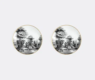 This decadent bread plate by Simone Guidarelli Home features a richly detailed garden scene in black and white, encircled with hand-finished gold edging. The landscape captivates with tall trees, a riverbank and imperial garden architecture. Part of a series of tableware that renders far flung places in monochrome, the design is drawn directly from Guidarelli's maximalist wallpaper portfolio. The 'Imperial Garden' bread plate, which comes as a set of two, can be layered with other pieces from the 'Souvenirs De Voyage' collection, or introduced into pared-black tablescapes as a statement in its own right. Not dishwasher safe.