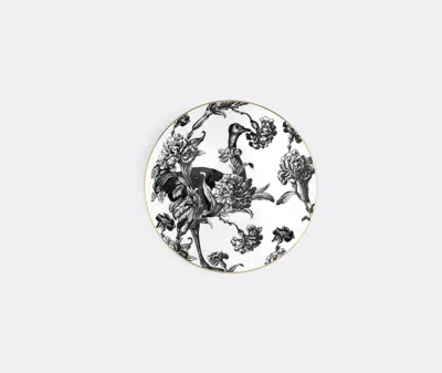 This decadent soup plate by Simone Guidarelli Home features a stylized ostrich amid ruffled flowers, tangerines, and foliage in black and white, encircled with hand-finished gold edging. Part of a series of tableware that renders opulent compositions in monochrome, the design is drawn directly from Guidarelli's maximalist wallpaper portfolio. Suitable for soups, stews and pasta dishes, the 'Tangerine Garden' soup plate can be layered with other pieces from the 'Souvenirs De Voyage' collection, or introduced into pared-black tablescapes as a statement in its own right. Not dishwasher safe.