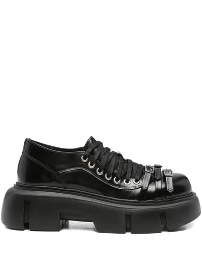 black polished leather lace-up fastening multiple buckles platform sole chunky rubber sole
