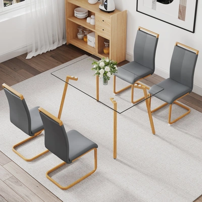 This table and chair set includes a glass dining table with wood color metal legs and four grey upholstered chairs, suitable for various settings such as dining rooms, patios, kitchens, restaurants, bistros, etc., and can also be used as a living room table, office desk, computer table, student desk, or game desk.