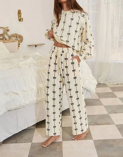 A match made in heaven. This two-piece set is so cute, you'll wish you could wear it out of the house! Did we mention how comfortable it is, too? You may want two sets!Elevate your wardrobe with the Sincerely Ours Classically Cool Set, a chic and timeless loungewear ensemble designed to blend sophistication with a playful allure. This cream knit set, featuring long sleeves and a hooded neckline, is punctuated by elegant black bows for a feminine charm. Made from a soft and stretchy material, it ensures all-day comfort and ease of movement, making it ideal for both casual brunches and polished evening outings. Originating from an unspecified location, this set speaks to classic elegance in its effortless design.