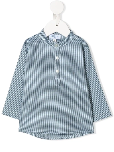 White/dark green cotton buttoned micro-print shirt from SIOLA featuring Haymarket check print, band collar, front button placket and long sleeves.