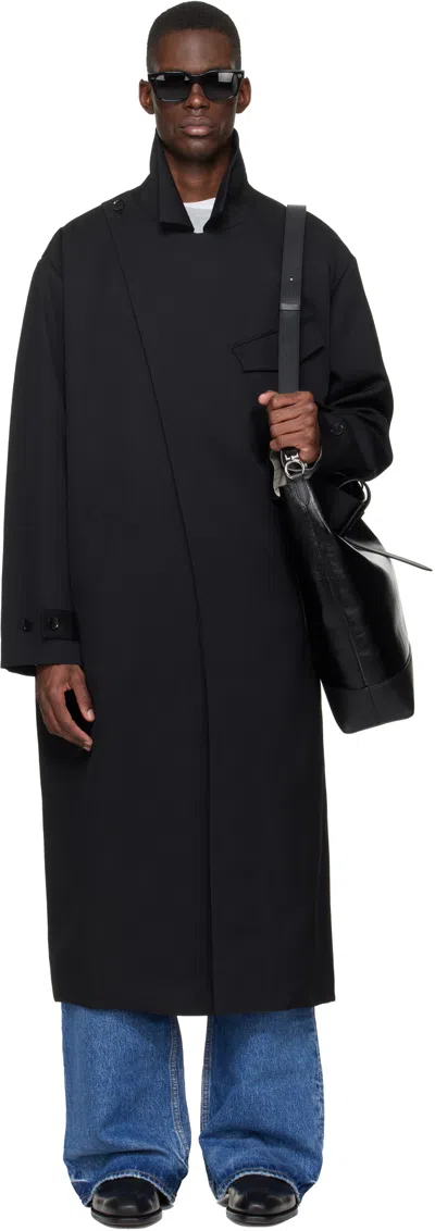 Wool twill coat. · Spread collar · Flap pocket at chest · Welt pockets at waist · Asymmetrical button closure · Adjustable button tab at cuffs · Buttoned expansion panel at back · Welt pocket at interior · Full satin lining Supplier color: Black