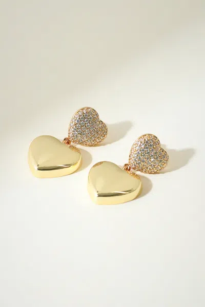 THE PAVE’ DOUBLE HEART EARRINGS SIZE: 1" Top to Bottom METAL: 18KT Gold Plated Brass STONES: Cubic Zirconia