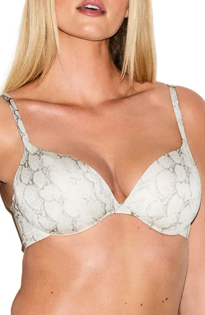 The Ultimate Bra redefines traditional push-up bras by enhancing your natural bust shape and completely transforming the look, shape, and fullness of your bust. This bra is made of a super soft sheen microfiber fabric with extra compressive side wings for smoothing. With a comfortable, concealed underwire and premium teardrop shaped foam pads, this bra sits seamlessly under clothing. Designed for a snug fit. If you are between sizes, we recommend sizing up one band size. | SKIMS Teardrop Push-Up Bra | Stone Pastel Snake Print | Light Neutral | Skims Ultimate | 42DD | Women's