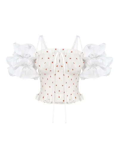 white all-over graphic print front tie fastening off-shoulder ruffled detailing