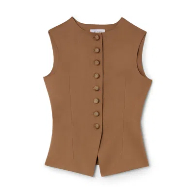The Sculpted Vest in Tan, Size 3: Cut from softly structured twill, this vest has a high neck, waist-shaping darts, and a cutaway hem that, together, create an elegant silhouette. It’s finished with eight faux-horn buttons spaced closely together, which looks chic and minimizes gapping. If you want to make it a suit, you should know there are matching trousers.3% elastane, 21% viscose, twill, 76% polyester.