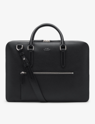 The City collection reimagines the briefcase this season. With spacious compartments, beautiful leather finishes and a stylish silhouette, this classic front zip briefcase will always stand the test of time. Carry by your side or wear over your shoulder for full comfort on-the-go. With room enough for your laptop, organiser and documents in one of it's two zip sections, it's bound to fit the brief. Black grain leather zip front large briefcase. Double zip opening. Black trim and handles in smooth calf leather. Tubular handles. Front zip pocket with gusset. Edge dyed. Tonal stitching. Cotton lined. Internal zip pocket. Internal slip pocket to fit 15" laptop. Removeable shoulder strap. Leather strap on back for luggage trolley. Made in Italy. Dimensions: W40 x H28.5 x D8cm / W15.7 x H11.2 x D3.1".