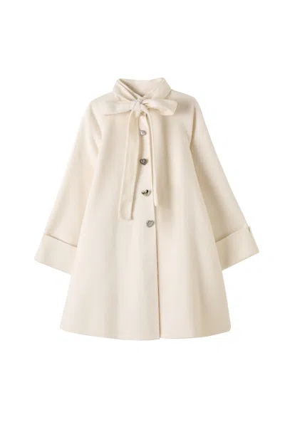 【A bow-tied coat that blends sweetness with timeless elegance.】 A soft and romantic A-line coat detailed with a statement bow at the neck and signature heart-shaped buttons.Its flared silhouette and wide cuffs create a gentle volume, offering a feminine touch to winter styling. Crafted from a soft wool-blend fabric that feels warm yet lightweight, this piece pairs beautifully with dresses or mini skirts for a polished, graceful look. Available in Pink, Ivory, and Gray — each color capturing a different mood of elegance. Color The color may appear different from the actual product due to lighting. Additionally, due to settings on the computer or smartphone, the color of the actual product may differ slightly from the image. Size and Chart Size Height (cm) Weight (lb) Length (in) Bust (in) Hem Width (in) 0 155-163 88–110 33.9 48.8 55.1 1 160-168 99–121 34.4 50.0 55.7 Details Material: SKU: SWFC254317 Imported